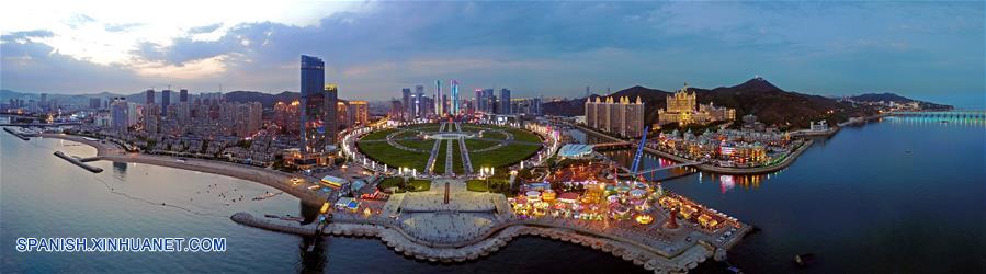DALIAN, junio 20, 2017 (Xinhua) -- Imagen combinada tomada el 11 de junio de 2017 de una vista aérea de la Plaza Xinghai en Dalian, provincia de Liaoning, en el noreste de China. Dalian es una de las ciudades sede del Foro Davos de Verano. (Xinhua/Li Xin)