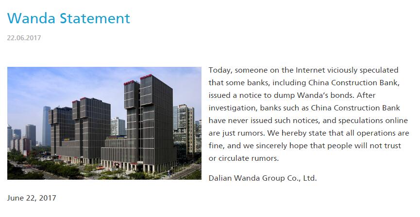 Wanda Group, la mayor empresa de propiedad comercial de China y el operador de cadenas de cine más grande del mundo, emitió un comunicado en su web al mediodía, aclarando que "después de una investigación, bancos como el Banco de Construcción de China nunca emitieron tales avisos y la especulación en línea no es más que un rumor. Declaramos que todas las operaciones están bien, y esperamos sinceramente que la gente no confíe o haga circular los rumores".