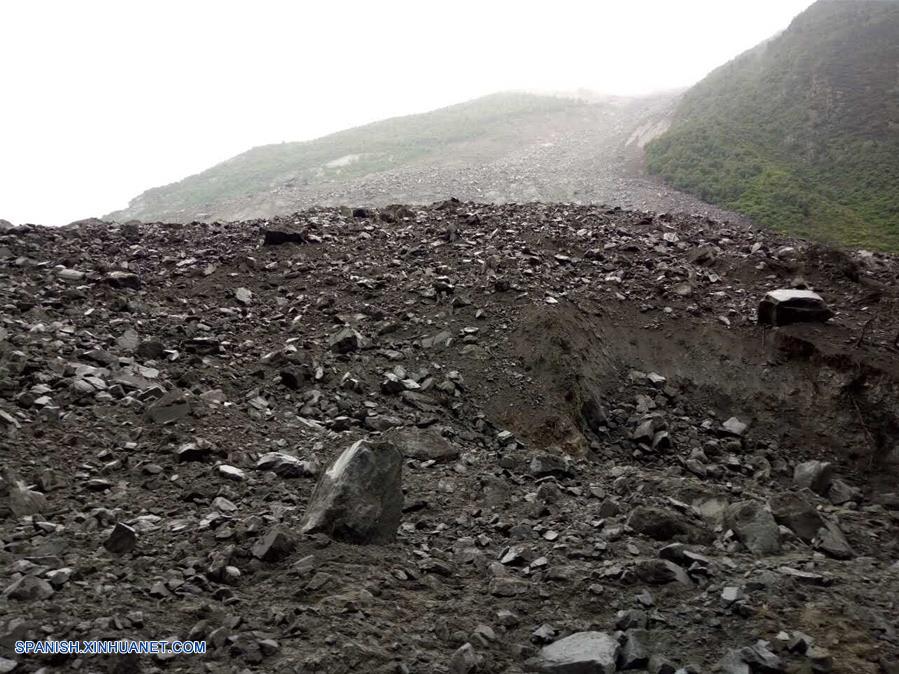 SICHUAN, junio 24, 2017 (Xinhua) -- Vista del sitio de un accidente después de un deslave en el poblado de Xinmo del condado Maoxian de la prefectura autónoma tibetana y qiang, en la provincia de Sichuan, en el suroeste de China, el 24 de junio de 2017. Un deslizamiento de tierra el sábado aplastó unas 40 casas, donde se teme que estén enterradas unas 100 personas. (Xinhua/Str)