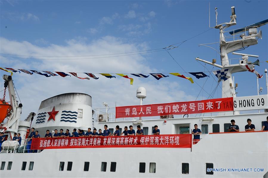 Investigadores científicos del Jiaolong esperan para desembarcar, en Qingdao, provincia de Shandong, en el este de China, el 23 de junio de 2017. (Xinhua/Zhang Xudong)