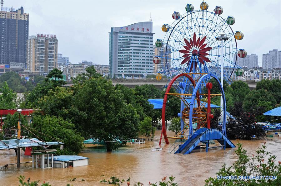 JIANGXI, junio 24, 2017 (Xinhua) -- Un parque permanece inundado en el centro del condado de Xiushui, provincia de Jiangxi, en el este de China, el 24 de junio de 2017. La parte norte de Jiangxi sufrió de lluvias torrenciales durante la noche del viernes. (Xinhua/Wan Xiang)