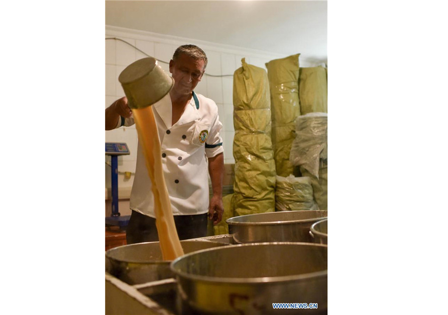 Xinjiang, 26/06/2017 (El Pueblo en Línea) - Memetynsup Sidiq, de 67 a?os, es el due?o de Margilan, ubicada en la zona turística de Kazanqi. Esta es la heladería más antigua de Yining, abierta por su padre en el a?o 1933. Memetynsup heredó el local y lo transformó en un restaurante de comida rápida, aunque el atractivo principal sigue siendo la venta de helados. Durante la temporada turística, la clásica heladería Margilan vende a diario más de 50 kilogramos de helado. En la foto, Memetynsup ajusta el caldo original para fijar el sabor y confeccionar el sabroso helado tradicional. Yining, Región Autónoma de Uygur de Xinjiang. 22 de junio de 2017. [Foto: Xinhua]