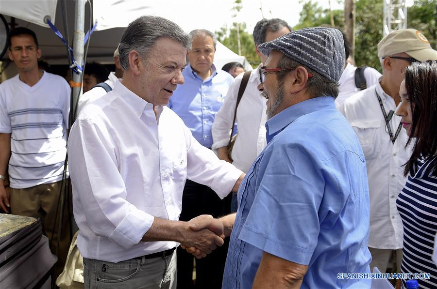 Imagen cedida por la Presidencia de Colombia, del presidente colombiano, Juan Manuel Santos (i-frente), estrechando la mano con el jefe máximo de las Fuerzas Armadas Revolucionarias de Colombia (FARC), Rodrigo Londo?o alias "Timochenko" (d-frente), durante la ceremonia de dejación de armas de las FARC, en Buenavista, una vereda del municipio de Mesetas, en el departamento de Meta, Colombia, el 27 de junio de 2017. En Buenavista, una vereda del municipio de Mesetas, en el departamento de Meta, se realizó el martes el acto final de dejación de armas por parte de la guerrilla de las Fuerzas Armadas Revolucionarias de Colombia (FARC). El acto estuvo encabezado por el presidente colombiano, Juan Manuel Santos; el jefe máximo de las FARC, Rodrigo Londo?o alias "Timochenko", y el Jefe de la Misión de Naciones Unidas en Colombia, Jean Arnault. En el evento también participaron ministros y altos funcionarios, representantes de países garantes, facilitadores del Acuerdo de Paz, autoridades civiles, congresistas y miembros de organizaciones sociales. (Xinhua/Efraín Herrera/Presidencia de Colombia)