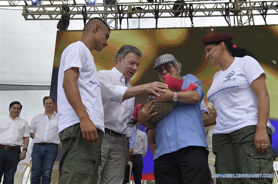 Imagen cedida por la Presidencia de Colombia, del presidente colombiano, Juan Manuel Santos (2-i), observando a un bebé que sostiene en brazos el jefe máximo de las Fuerzas Armadas Revolucionarias de Colombia (FARC), Rodrigo Londo?o alias "Timochenko" (2-d), durante la ceremonia de dejación de armas de las FARC, en Buenavista, una vereda del municipio de Mesetas, en el departamento de Meta, Colombia, el 27 de junio de 2017. En Buenavista, una vereda del municipio de Mesetas, en el departamento de Meta, se realizó el martes el acto final de dejación de armas por parte de la guerrilla de las Fuerzas Armadas Revolucionarias de Colombia (FARC). El acto estuvo encabezado por el presidente colombiano, Juan Manuel Santos; el jefe máximo de las FARC, Rodrigo Londo?o alias "Timochenko", y el Jefe de la Misión de Naciones Unidas en Colombia, Jean Arnault. En el evento también participaron ministros y altos funcionarios, representantes de países garantes, facilitadores del Acuerdo de Paz, autoridades civiles, congresistas y miembros de organizaciones sociales. (Xinhua/Efraín Herrera/Presidencia de Colombia)