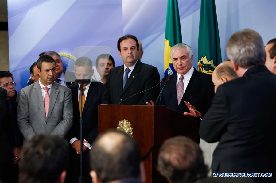 Imagen cedida por la Presidencia de Brasil, del presidente brasile?o, Michel Temer (c-atrás), participando durante una conferencia de prensa en Brasilia, Brasil, el 27 de junio de 2017. En su primera declaración tras ser denunciado penalmente por corrupción, el presidente de Brasil, Michel Temer, dijo el martes que las acusaciones en su contra son "una pieza de ficción", que no existen pruebas de que haya cometido actos ilícitos y que no huirá a las batallas que se le presentan por delante para defender su cargo y su honra. (Xinhua/Alan Santos/Presidencia de Brasil)