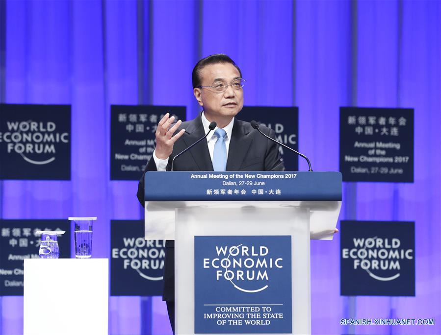 El primer ministro, Li Keqiang pronuncia un discurso en la ceremonia inaugural de la Reunión Anual de Nuevos Campeones 2017, también conocida como el Foro Davos de Verano, en la ciudad costera china de Dalian, en el noreste del país.(Xinhua/Pang Xinglei)