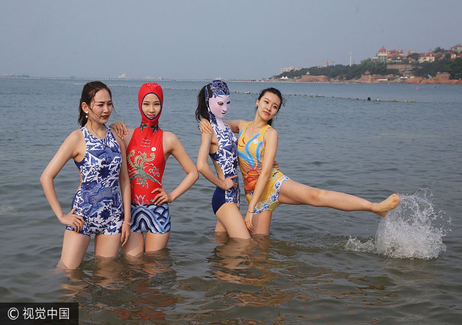 Varias modelos presentan la séptima temporada de los bikinis faciales en la playa de Qingdao, el 28 de junio de 2017. [Foto / VCG]