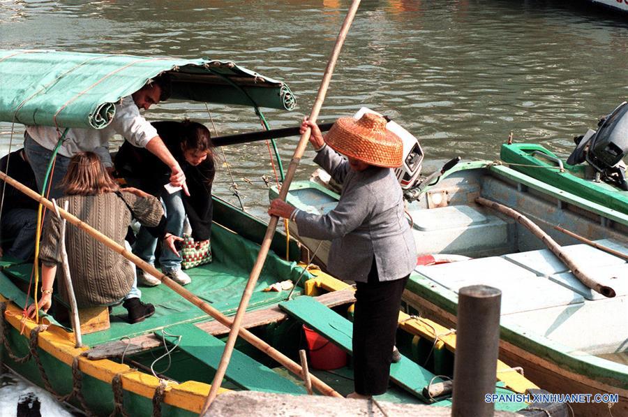 Imagen de archivo del 27 de febrero de 1997 de una residente de la villa pesquera Tai O, remando a bordo de un bote mientras lleva a turistas en un recorrido en Hong Kong, en el sur de China. Esta serie de imágenes de archivo muestran la vida cotidiana de los residentes de Hong Kong en el a?o de 1997. El 1 de julio marca el 20 aniversario del regreso de Hong Kong a China. (Xinhua/Zhang Ruiqi)