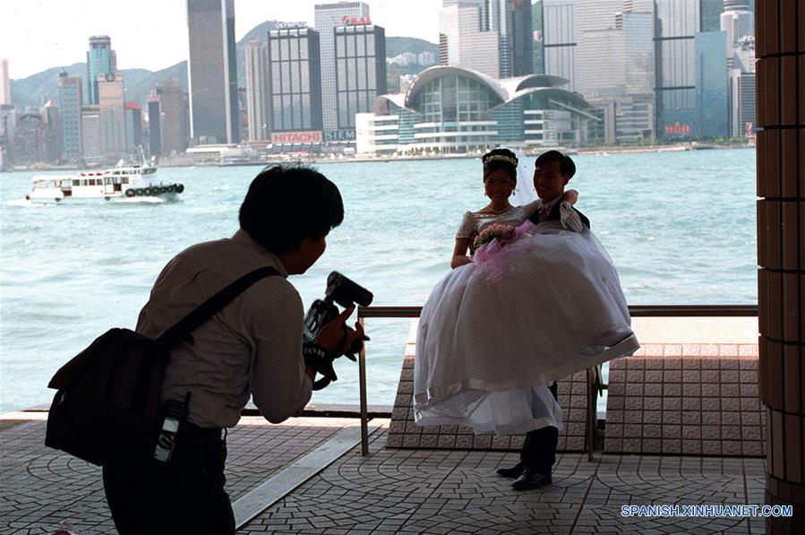 HONG KONG, junio 29, 2017 (Xinhua) -- Imagen de archivo de junio de 1997 de una pareja de recién casados posando en Tsim Sha Tui de Kowloon, en Hong Kong, en el sur de China. Esta serie de imágenes de archivo muestran la vida cotidiana de los residentes de Hong Kong en el a?o de 1997. El 1 de julio marca el 20 aniversario del regreso de Hong Kong a China. (Xinhua/Jin Zuoting)