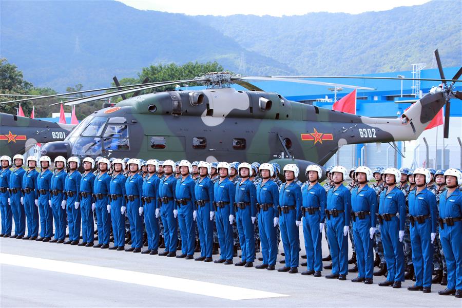 HONG KONG, junio 30, 2017 (Xinhua) -- El equipo del helicóptero Z-8 de la guarnición del Ejército Popular de Liberación (EPL) en la Región Administrativa Especial de Hong Kong, permanecen en las barracas de Shek Kong, en Hong Kong, en el sur de China, el 30 de junio de 2017. El presidente de China, Xi Jinping, también secretario general del Comité Central del Partido Comunista de China y presidente de la Comisión Militar Central, inspeccionó el viernes la guarnición del Ejército Popular de Liberación (EPL) en la Región Administrativa Especial de Hong Kong, en las barracas de Shek Kong. (Xinhua/Li Gang)
