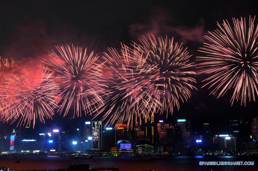 Fuegos artificiales iluminan el cielo durante un espectáculo de fuegos artificiales llevado a cabo con motivo del 20 aniversario del regreso de Hong Kong a la patria, en Hong Kong, en el sur de China, el 1 de julio de 2017. (Xinhua/Qin Qing)