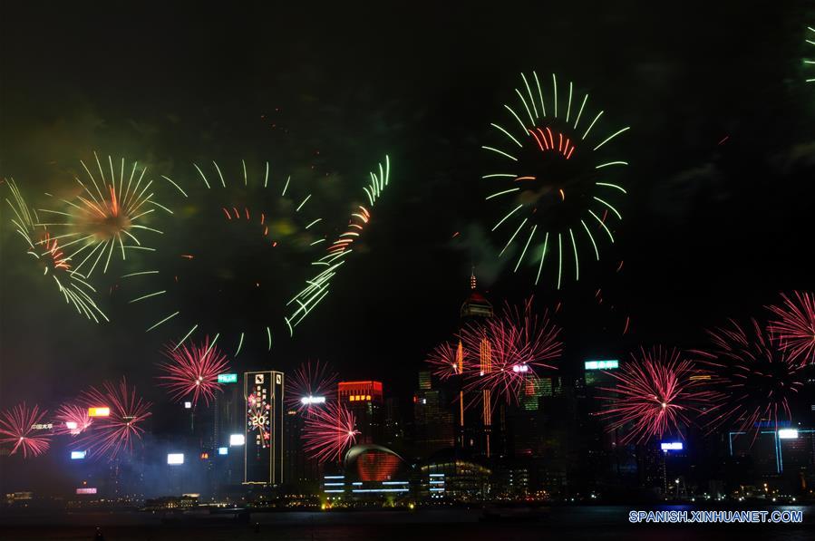 Fuegos artificiales iluminan el cielo durante un espectáculo de fuegos artificiales llevado a cabo con motivo del 20 aniversario del regreso de Hong Kong a la patria, en Hong Kong, en el sur de China, el 1 de julio de 2017. (Xinhua/Qin Qing)