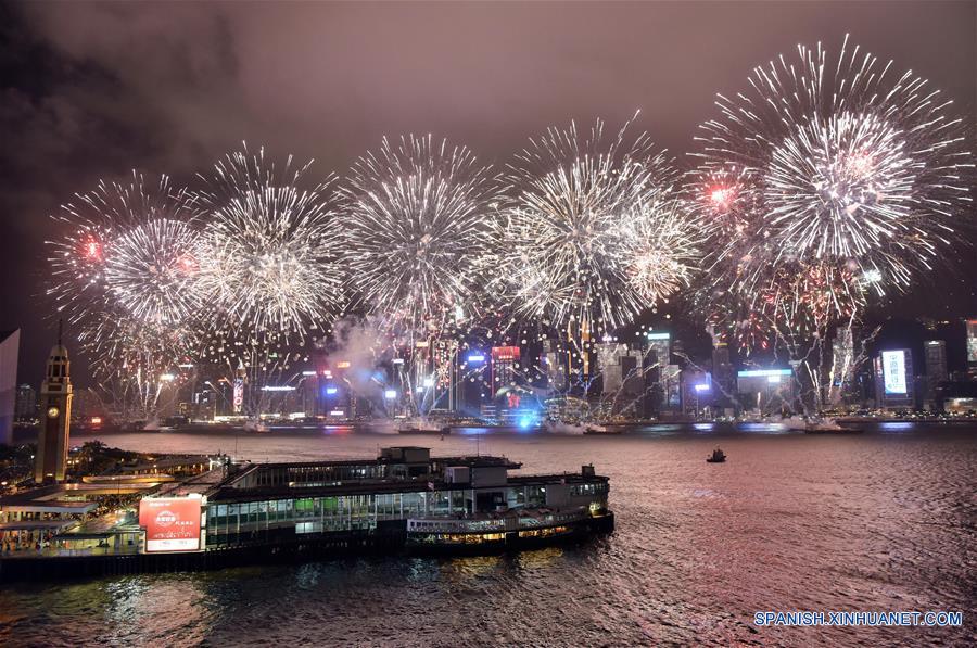 Fuegos artificiales iluminan el cielo durante un espectáculo de fuegos artificiales llevado a cabo con motivo del 20 aniversario del regreso de Hong Kong a la patria, en Hong Kong, en el sur de China, el 1 de julio de 2017. (Xinhua/Wang Xi)