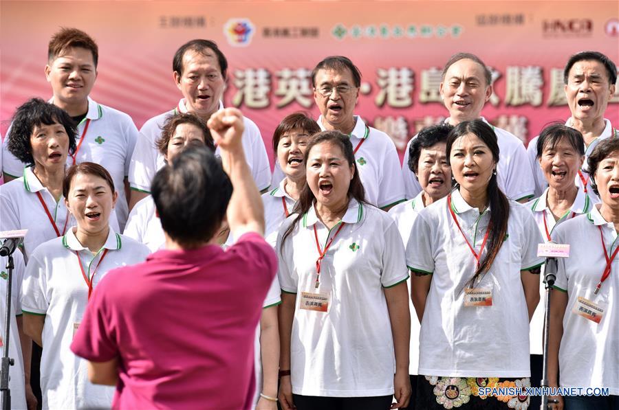 Intengrantes de un coro actúan en un carnaval de música llevado a cabo con motivo del 20 aniversario del regreso de Hong Kong a la patria, en el Parque Tamar en Hong Kong, en el sur de China, el 1 de julio de 2017. (Xinhua/Wang Xi)