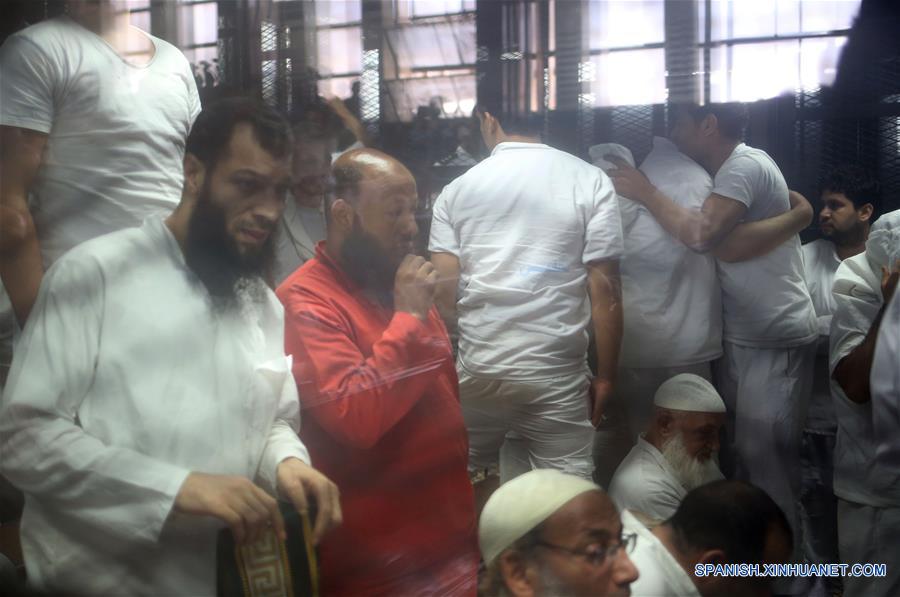 Acusados reaccionan en una jaula durante su juicio en El Cairo, Egipto, el 2 de julio de 2017. Un tribunal de Egipto sentenció el domingo a 20 personas a muerte por cargos de asesinar a 12 oficiales de policía en 2013, informó la agencia estatal de noticias MENA. (Xinhua/Ahmed Gomaa)