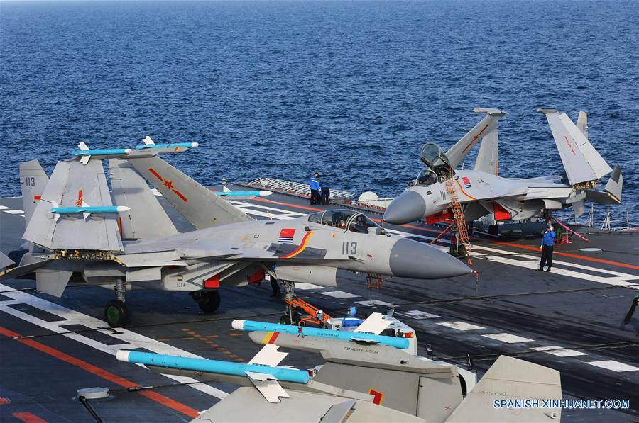 A BORDO DEL PORTAAVIONES LIAONING, julio 3, 2017 (Xinhua) -- Imagen del 1 de julio de 2017, de un caza J-15 siendo transferido en el portaaviones Liaoning. Una flotilla, incluyendo el portaaviones Liaoning, ha estado llevando a cabo un entrenamiento trans-regional desde que salió de Qingdao, en el este de China, el 25 de junio. (Xinhua/Zeng Tao)