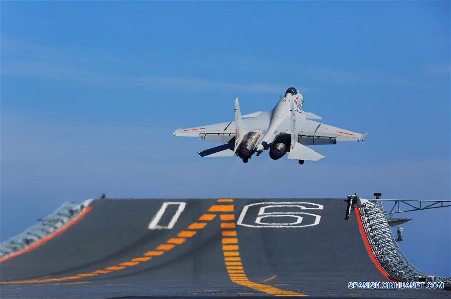 A BORDO DEL PORTAAVIONES LIAONING, julio 3, 2017 (Xinhua) -- Imagen del 1 de julio de 2017, de un caza J-15 despegando del portaaviones Liaoning. Una flotilla, incluyendo el portaaviones Liaoning, ha estado llevando a cabo un entrenamiento trans-regional desde que salió de Qingdao, en el este de China, el 25 de junio. (Xinhua/Zeng Tao)