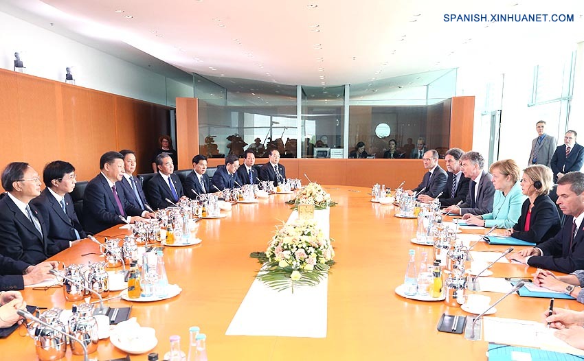 El presidente de China, Xi Jinping, y la canciller de Alemania, Angela Merkel, acordaron hoy en Berlín elevar las relaciones entre China y Alemania a niveles nuevos y mayores.(Xinhua/Yao Dawei)