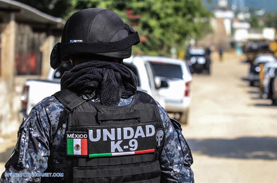 Un elemento de la unidad policial K-9 vigila un acceso luego del enfrentamiento entre reos ocurrido durante la madrugada en el Centro de Readaptación Social en el puerto de Acapulco, en el estado de Guerrero, México, el 6 de julio de 2017. (Xinhua/David Guzmán)