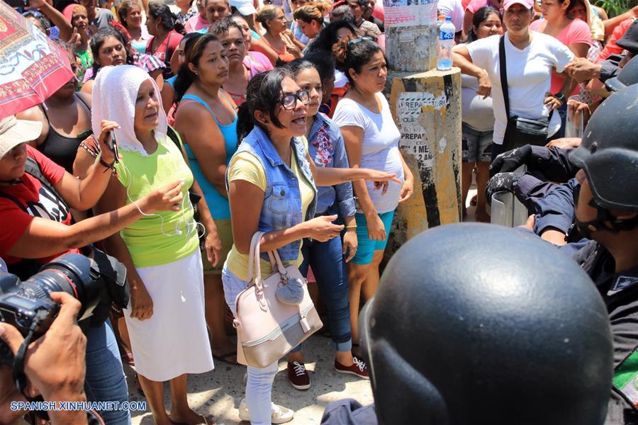 Familiares de los presos encaran a elementos de las fuerzas de seguridad en las afueras del Centro de Readaptación Social, luego del enfrentamiento entre reos ocurrido durante la madrugada, en Acapulco, estado de Guerrero, México, el 6 de julio de 2017. (Xinhua/David Guzmán)