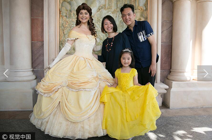 Mantou lleva un vestido de princesa amarillo, inspirado en La Bella y La Bestia, en una foto con sus padres y una princesa de Disney en Disneyland Shanghai, el 21 de mayo. [Foto / VCG]