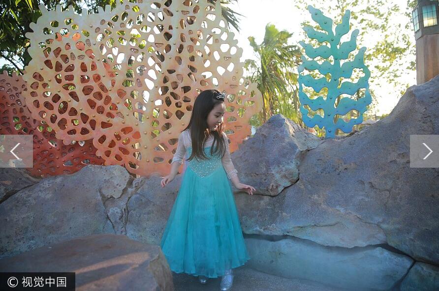 Mantou lleva un vestido azul elaborado por su padre, inspirado en la película de Disney Frozen, en Disneyland Shanghai, el 21 de mayo. [Foto / VCG]