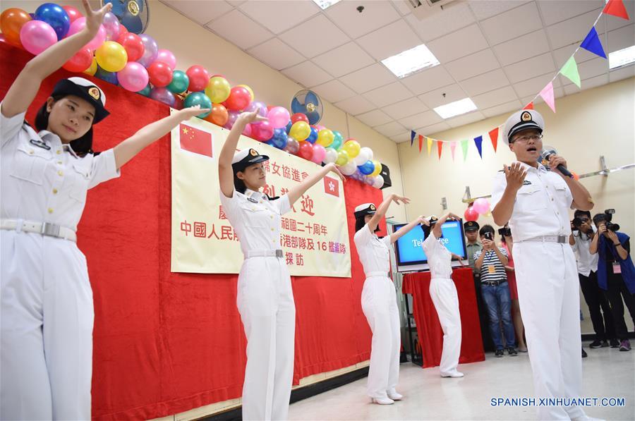 HONG KONG, julio 10, 2017 (Xinhua) -- Soldados del portaaviones chino Liaoning realizan una presentación durante una visita al Hogar de Cuidado y Atención Ho Leung Kit Ting de la Liga de Mujeres de Asia Limited en Hong Kong, en el sur de China, el 10 de julio de 2017. Cerca de 60 soldados y oficiales del portaaviones Liaoning visitaron el lunes a los ancianos del Hogar de Cuidado y Atención. (Xinhua/Wang Shen)