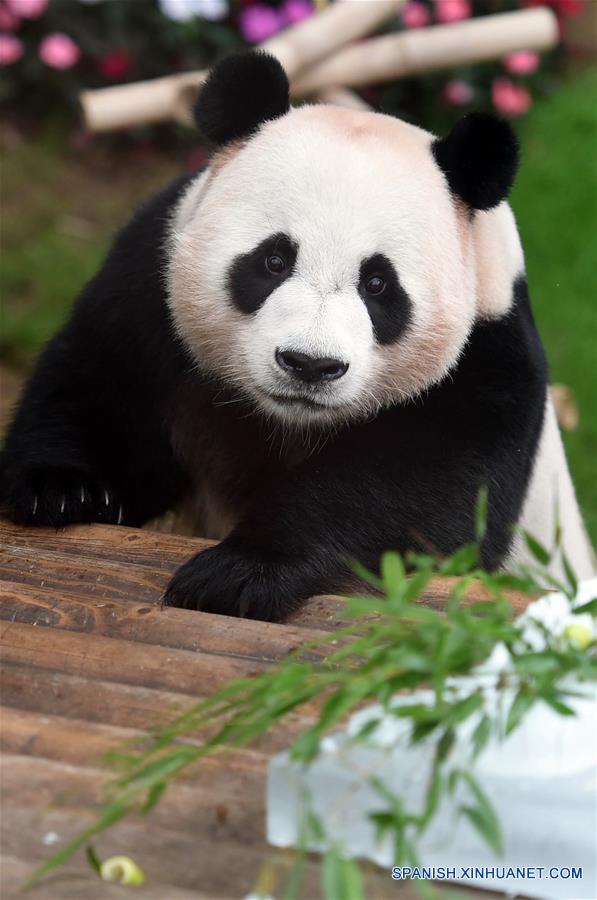 YONGIN, julio 12, 2017 (Xinhua) -- El panda gigante chino "Le Bao" observa su "comida de cumplea?os" en el Zoológico de Everland, en la ciudad de Yongin, República de Corea, el 12 de julio de 2017. El cumplea?os para uno de los dos pandas gigantes, arrendados por China, fue celebrado el miércoles en el Zoológico de Everland, el mayor parque temático de República de Corea localizado en Yongin, a 40 kilómetros al sur de la capital Seúl. (Xinhua/Newsis)