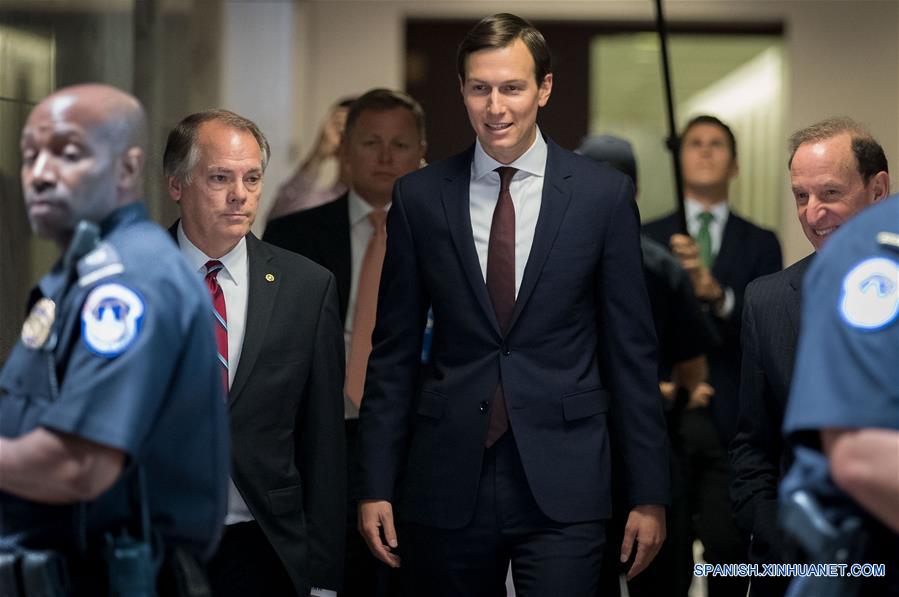 WASHINGTON D.C., julio 24, 2017 (Xinhua) -- Jared Kushner (c), yerno del presidente estadounidense Donald Trump y consejero superior de la Casa Blanca se retira después de testificar durante una audiencia a puerta cerrada del Comité de Inteligencia del Senado en Capitol Hill, Washington D.C., Estados Unidos, el 24 de julio de 2017. De acuerdo con información de la prensa local, el consejero superior de la Casa Blanca, Jared Kushner el lunes negó haber coludido con el gobierno ruso a pesar de las cuatro reuniones con ciudadanos rusos durante el periodo de campa?a y transición. (Xinhua/Ting Shen)
