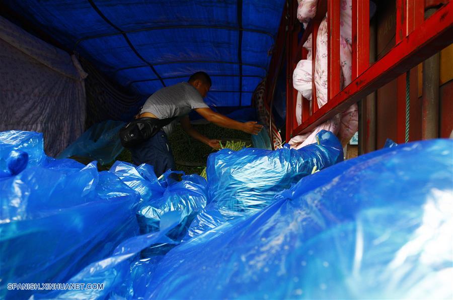 SHANGHAI, julio 25, 2017 (Xinhua) -- Trabajadores descargan caupí en el mercado al por mayor Jiangqiao, en Shanghai, en el este de China, el 25 de julio de 2017. Una alerta roja por altas temperaturas fue emitida el martes por el Observatorio Meteorológico Central de Shanghai cuando se pronostica que la temperatura alcance los 40 grados centígrados en las siguientes 24 horas. (Xinhua/Fang Zhe)