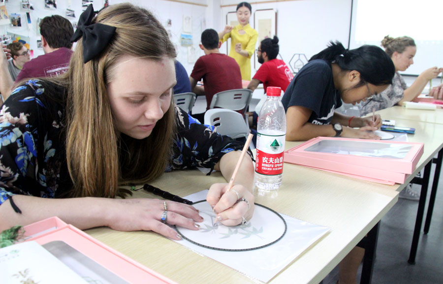 Una estudiante estadounidense dibuja un patrón en forma de bambú. [Foto de Wang Jiankang / Xinhua]