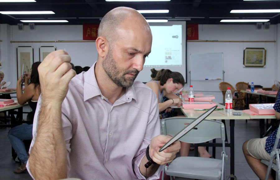 Un estudiante estadounidense aprende a bordar. [Foto de Wang Jiankang / Xinhua]
