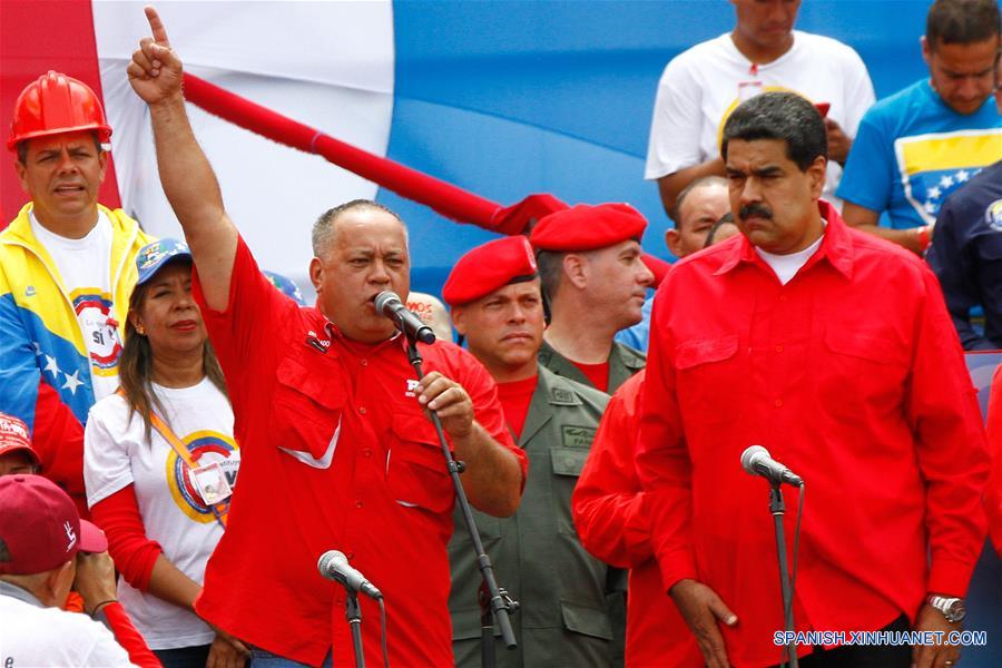CARACAS, julio 27, 2017 (Xinhua) -- El candidato a la Asamblea Nacional Constituyente (ANC), Diosdado Cabello (i-frente), y el presidente venezolano, Nicolás Maduro (d-frente), participan en el cierre de campa?a de la ANC, en Caracas, Venezuela, el 27 de julio de 2017. El presidente de Venezuela, Nicolás Maduro, advirtió el jueves a la alianza opositora Mesa de la Unidad Democrática (MUD) que, tras instalarse la Asamblea Nacional Constituyente (ANC), luego del 30 de julio, habrá un diálogo "obligatorio" entre las partes. Durante el acto general de cierre de la campa?a constituyente, en Caracas, Maduro reiteró a la dirigencia opositora su disposición de instalar un mesa de diálogo, previo a la ANC que se elegirá el domingo próximo. (Xinhua/Boris Vergara)