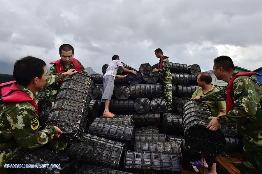 FUJIAN, julio 29, 2017 (Xinhua) -- Soldados ayudan a los pescadores a transportar las jaulas de mariscos mientras se preparan para evitar da?os antes de que el tifón Nesat toque tierra, en la ciudad de Ningde de la provincia de Fujian, en el sureste de China, el 29 de julio de 2017. Más de 3,100 personas han sido evacuadas en la provincia suroriental china de Fujian en previsión de la llegada del tifón Nesat. (Xinhua/Yuan Ziyou)
