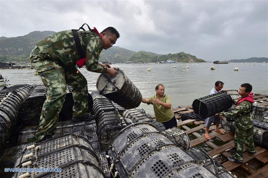 FUJIAN, julio 29, 2017 (Xinhua) -- Soldados ayudan a los pescadores a transportar las jaulas de mariscos mientras se preparan para evitar da?os antes de que el tifón Nesat toque tierra, en la ciudad de Ningde de la provincia de Fujian, en el sureste de China, el 29 de julio de 2017. Más de 3,100 personas han sido evacuadas en la provincia suroriental china de Fujian en previsión de la llegada del tifón Nesat. (Xinhua/Yuan Ziyou)