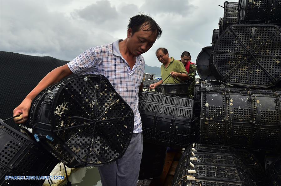 FUJIAN, julio 29, 2017 (Xinhua) -- Pescadores transportan jaulas de mariscos mientras se preparan para evitar da?os antes de que el tifón Nesat toque tierra, en la ciudad de Ningde de la provincia de Fujian, en el sureste de China, el 29 de julio de 2017. Más de 3,100 personas han sido evacuadas en la provincia suroriental china de Fujian en previsión de la llegada del tifón Nesat. (Xinhua/Yuan Ziyou)