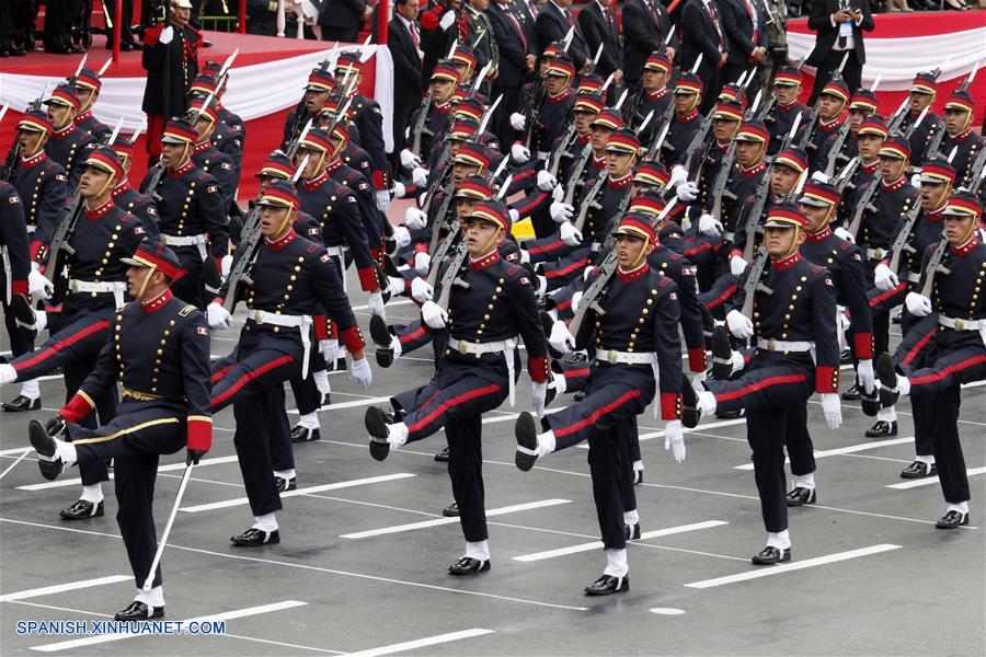 Miembros de las Fuerzas Armadas peruanas participan durante la Gran Parada y Desfile Cívico-Militar, en el marco de las celebraciones del 196 Aniversario de la Independencia de Perú, en la ciudad de Lima, Perú, el 29 de julio de 2017. (Xinhua/Luis Camacho)