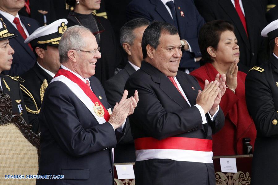 El presidente peruano, Pedro Pablo Kuczynski (i-frente), acompa?ado por el ministro de Defensa, Jorge Nieto Montesinos (d-frente), observa la Gran Parada y Desfile Cívico-Militar, en el marco de las celebraciones del 196 Aniversario de la Independencia de Perú, en la ciudad de Lima, Perú, el 29 de julio de 2017. (Xinhua/Luis Camacho)