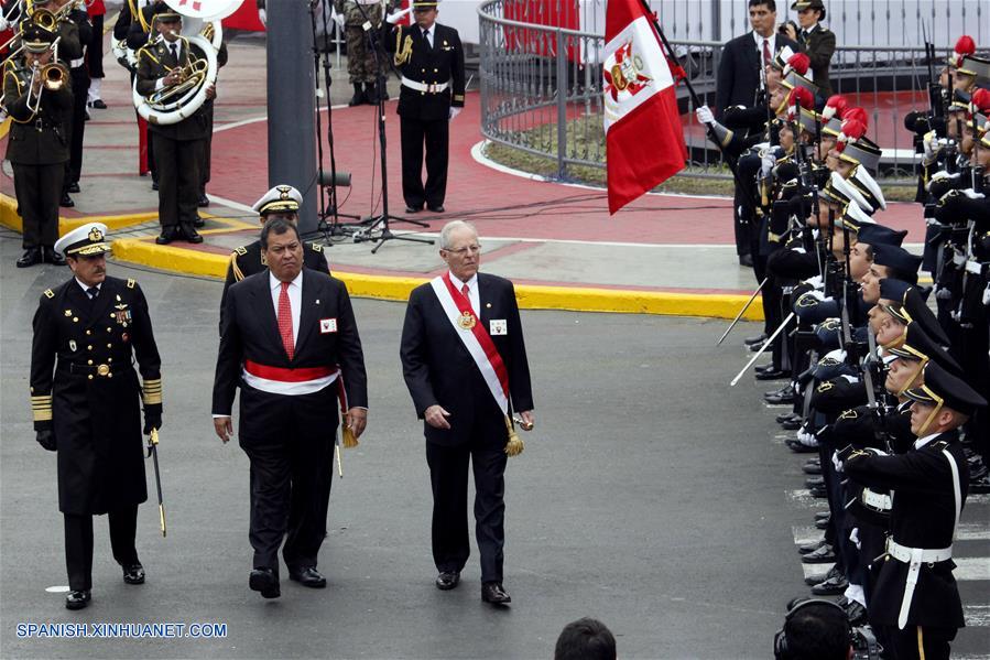 El presidente peruano, Pedro Pablo Kuczynski (3-i-frente), acompa?ado por el ministro de Defensa, Jorge Nieto Montesinos (2-i-frente), participa durante la Gran Parada y Desfile Cívico-Militar, en el marco de las celebraciones del 196 Aniversario de la Independencia de Perú, en la ciudad de Lima, Perú, el 29 de julio de 2017.(Xinhua/Luis Camacho)