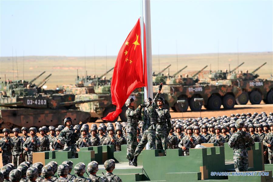 MONGOLIA INTERIOR, julio 30, 2017 (Xinhua) -- Una ceremonia de izamiento de bandera es llevada a cabo durante un desfile militar para conmemorar el 90 aniversario de la fundación del Ejército Popular de Liberación (EPL), en la base de entrenamiento de Zhurihe, en la Región Autónoma de Mongolia Interior, en el norte de China, el 30 de julio de 2017. El presidente de China, Xi Jinping, también secretario general del Comité Central del Partido Comunista de China (PCCh) y presidente de la Comisión Militar Central, inspeccionará a las tropas y pronunciará un importante discurso. (Xinhua/Li Gang)