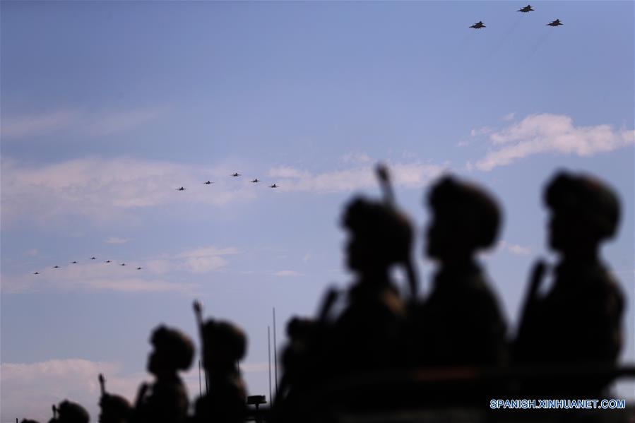 MONGOLIA INTERIOR, julio 30, 2017 (Xinhua) -- Aeronaves de combate vuelan durante un desfile militar en la base de entrenamiento de Zhurihe, en la Región Autónoma de Mongolia Interior, en el norte de China, el 30 de julio de 2017. China comenzó el domingo un gran desfile militar para conmemorar el 90 aniversario de la fundación del Ejército Popular de Liberación (EPL). (Xinhua/Fei Maohua)