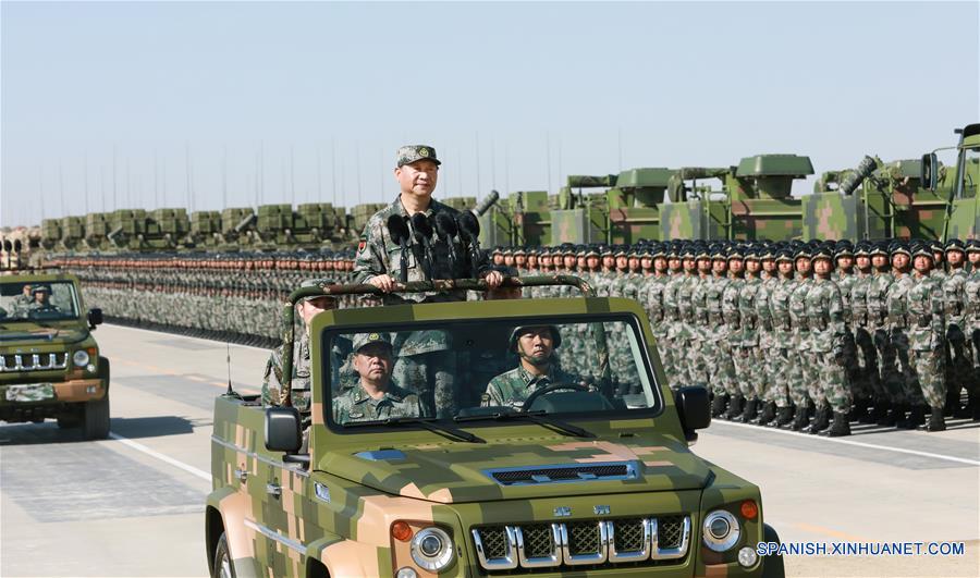 El presidente de China, Xi Jinping, también secretario general del Comité Central del Partido Comunista de China (PCCh) y presidente de la Comisión Militar Central, pasa revista a las fuerzas armadas como parte de las conmemoraciones para marcar el 90 aniversario de la fundación del Ejército Popular de Liberación (EPL), en la base de entrenamiento militar de Zhurihe, en la región autónoma de Mongolia Interior, en el norte de China, el 30 de julio de 2017. (Xinhua/Li Gang)