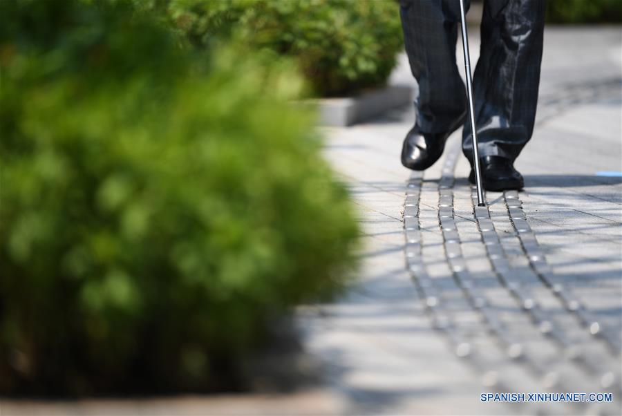 Una persona con discapacidad visual camina por una acera para invidentes, en el distrito de Jiangbei de Chongqing, en el suroeste de China, el 1 de agosto de 2017. Chongqing mejoró las instalaciones de accesibilidad para construir una mejor ciudad para personas con discapacidad. (Xinhua/Wang Quanchao)