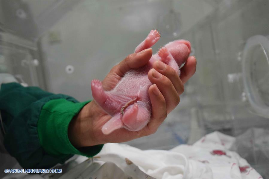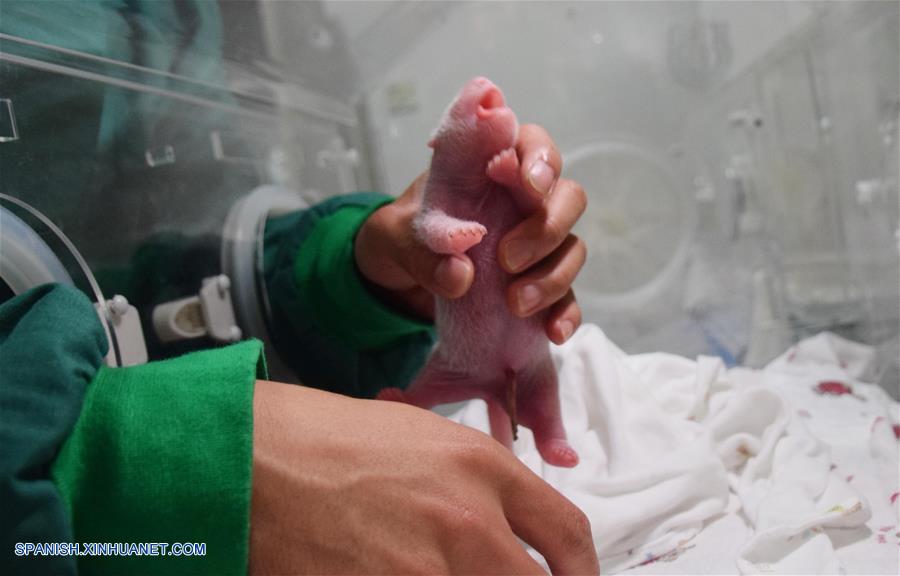 Imagen del 31 de julio de 2017 del primer cachorro de panda gigante nacido de madre en cautiverio y de padre silvestre en la provincia de Sichuan, en el suroeste de China. (Xinhua/Str)
