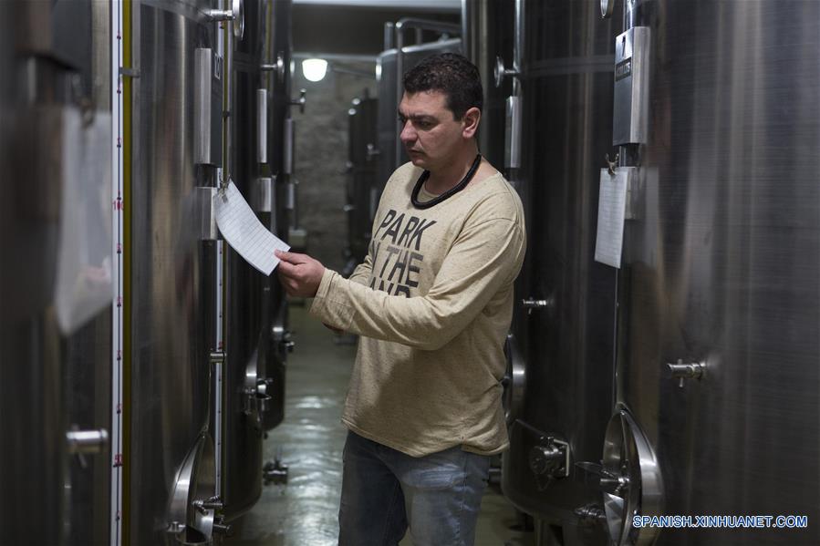 Imagen del 22 de julio de 2017 de un empleado revisando los tanques de almacenado en la Empresa Olivícola y Acetaia Laur, en la localidad de Cruz de Piedra, departamento Maipú, en la provincia de Mendoza, Argentina. (Xinhua/Martín Zabala)