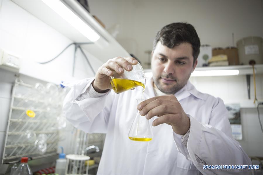 Imagen del 22 de julio de 2017 de un empleado vertiendo aceite de oliva a un matraz de Erlenmeyer en el laboratorio de control de calidad de la Empresa Olivícola y Acetaia Laur, en la localidad de Cruz de Piedra, departamento Maipú, en la provincia de Mendoza, Argentina. (Xinhua/Martín Zabala)