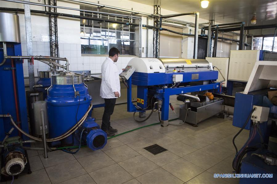 Imagen del 22 de julio de 2017 de un empleado monitoreando una máquina centrifugadora para la extracción de aceite en la Empresa Olivícola y Acetaia Laur, en la localidad de Cruz de Piedra, departamento Maipú, en la provincia de Mendoza, Argentina. (Xinhua/Martín Zabala)