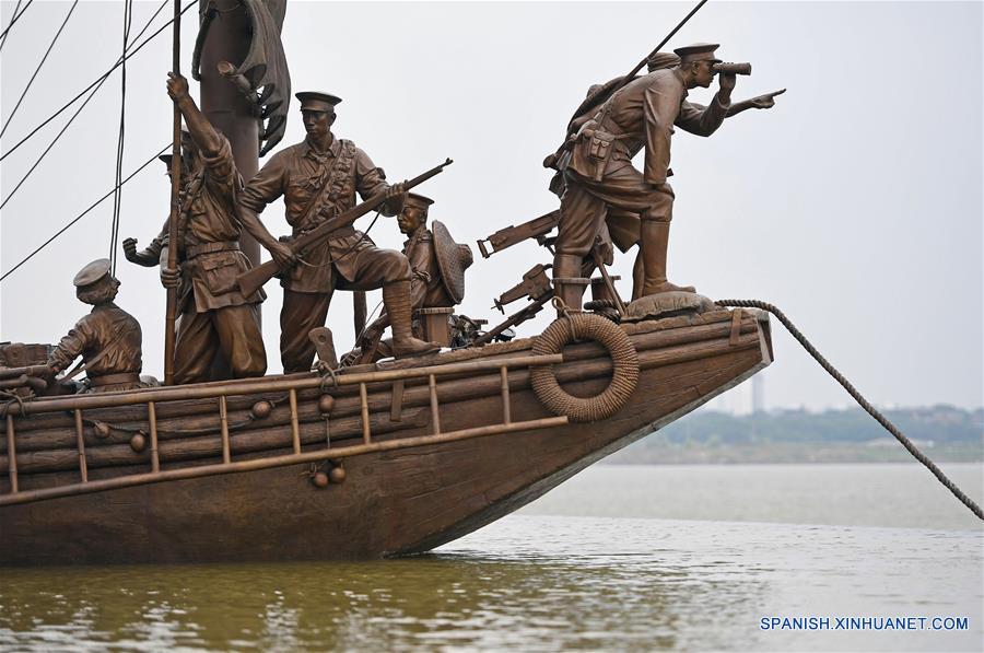 Vista de esculturas que conmemoran el 90 aniversario de la fundación del Ejército Popular de Liberación (EPL), en una plaza en Nanchang, en la provincia de Jiangxi, en el este de China, el 31 de julio de 2017. La plaza de las esculturas, cubrendo una zona de 16,000 metros cuadrados, fue abierta el lunes al público. (Xinhua/Wan Xiang)