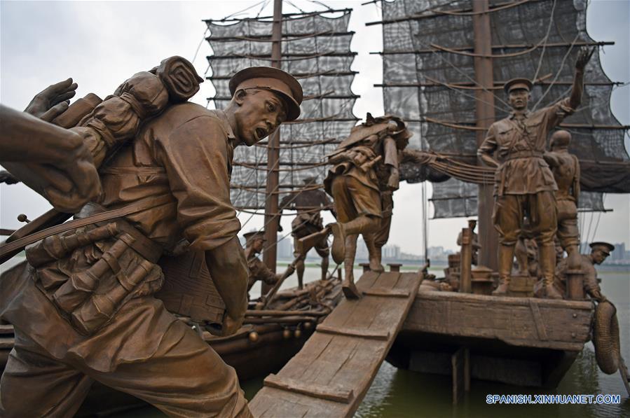 Vista de esculturas que conmemoran el 90 aniversario de la fundación del Ejército Popular de Liberación (EPL), en una plaza en Nanchang, en la provincia de Jiangxi, en el este de China, el 31 de julio de 2017. La plaza de las esculturas, cubrendo una zona de 16,000 metros cuadrados, fue abierta el lunes al público. (Xinhua/Wan Xiang)