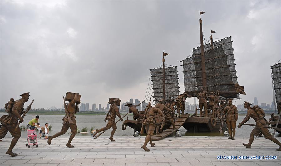Vista de esculturas que conmemoran el 90 aniversario de la fundación del Ejército Popular de Liberación (EPL), en una plaza en Nanchang, en la provincia de Jiangxi, en el este de China, el 31 de julio de 2017. La plaza de las esculturas, cubrendo una zona de 16,000 metros cuadrados, fue abierta el lunes al público. (Xinhua/Wan Xiang)
